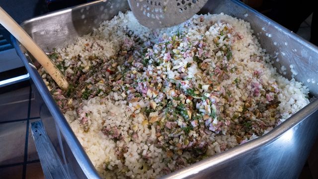 Heringsdorf (dpa) - Mit einer Portion von 147 Kilogramm Heringssalat hat der Gastronom André Domke in Heringsdorf auf Usedom einen Weltrekord aufgestellt. Bei der Zubereitung und dem anschließenden Verzehr des Gerichts namens Heringshäckerle haben unter anderem der ehemalige Profiboxer Axel Schulz u